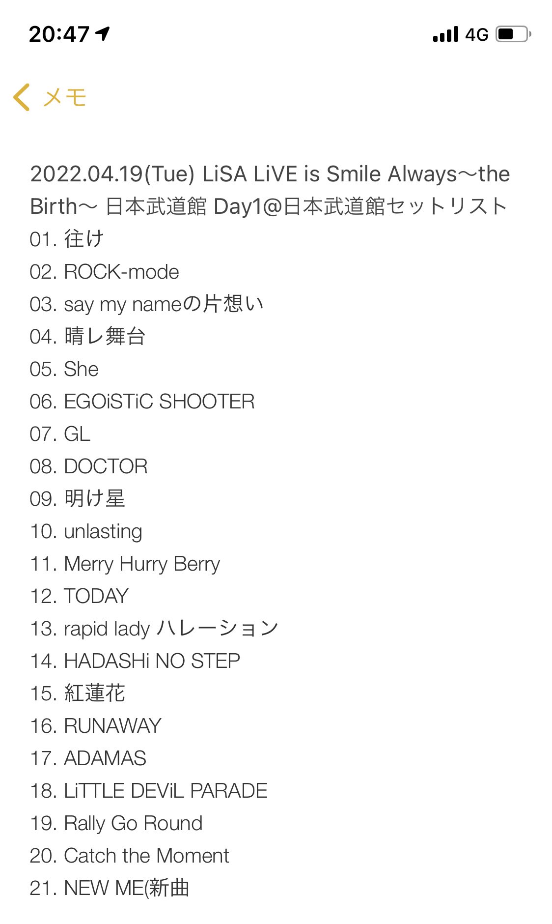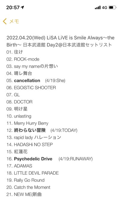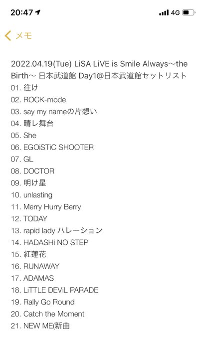 【ネタバレ注意?】2022.04.19(Tue) LiSA LiVE is Smile Always~the Birth~ 日本武道館 Day1@日本武道館セットリスト #LiSA pic.twitter.com/FKhR3TvMSk