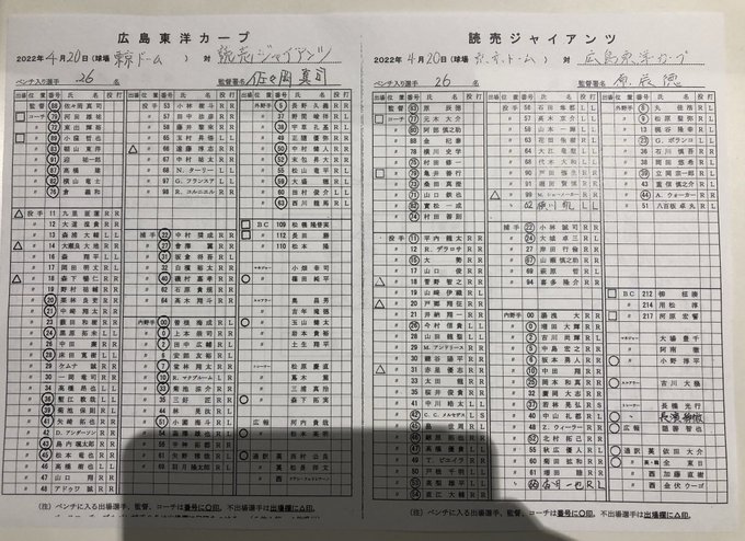 今日のスタメン。東京ドームでのビジター球団のスタメン発表では、6番左翼 #長野久義 選手のコールに一番の拍手が送られていました(淳)。