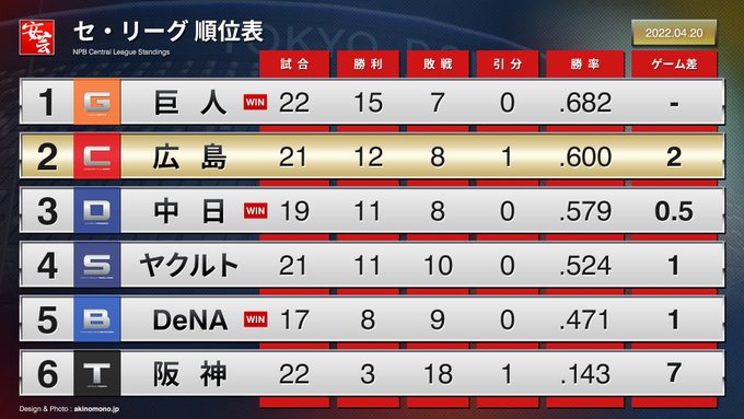 【順位表】カープ、今季2度目の3連敗(2022年4月20日)