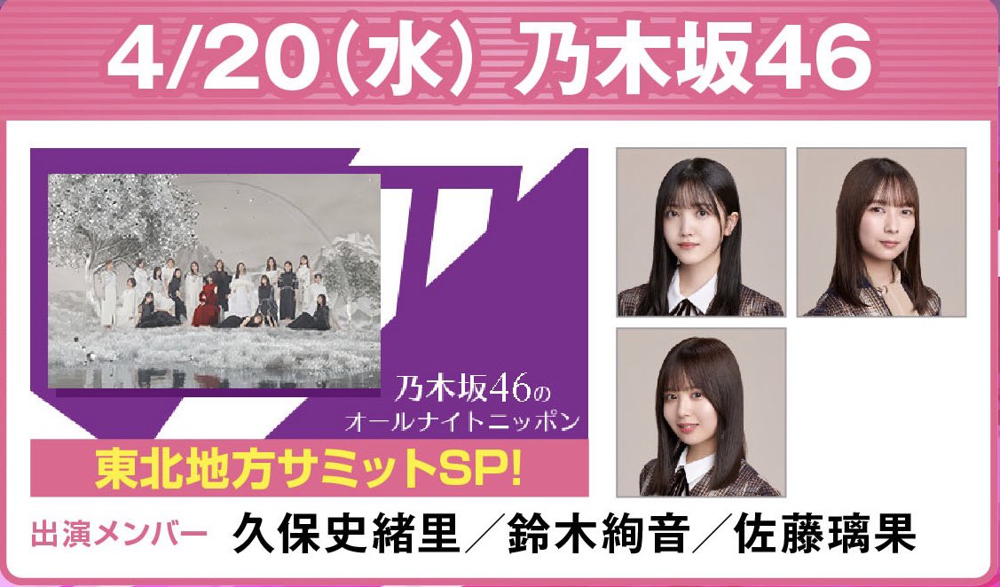 本日4月20日(水)25:00〜、ニッポン放送「#乃木坂46のオールナイトニッポン」に、#久保史緒里、#佐藤璃果、#鈴木絢音 が生出演します!
