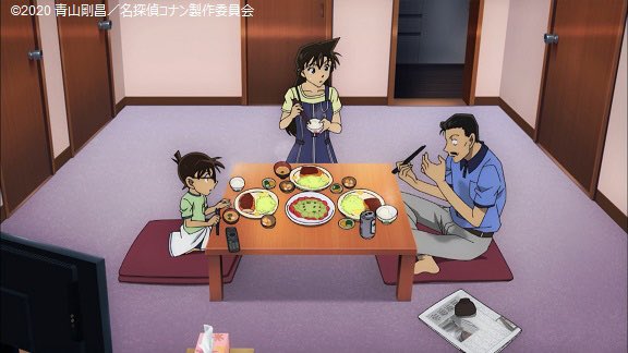 永岡智佳監督がこだわったというシーンの一つが、小五郎がお椀の中身をこぼすシーン。普段からご飯を作ってくれている蘭に感謝する小五郎の姿から、コナンと3人で食卓を囲む毛利家の「日常」を描き、赤井家と対比させたかったのだそう。
