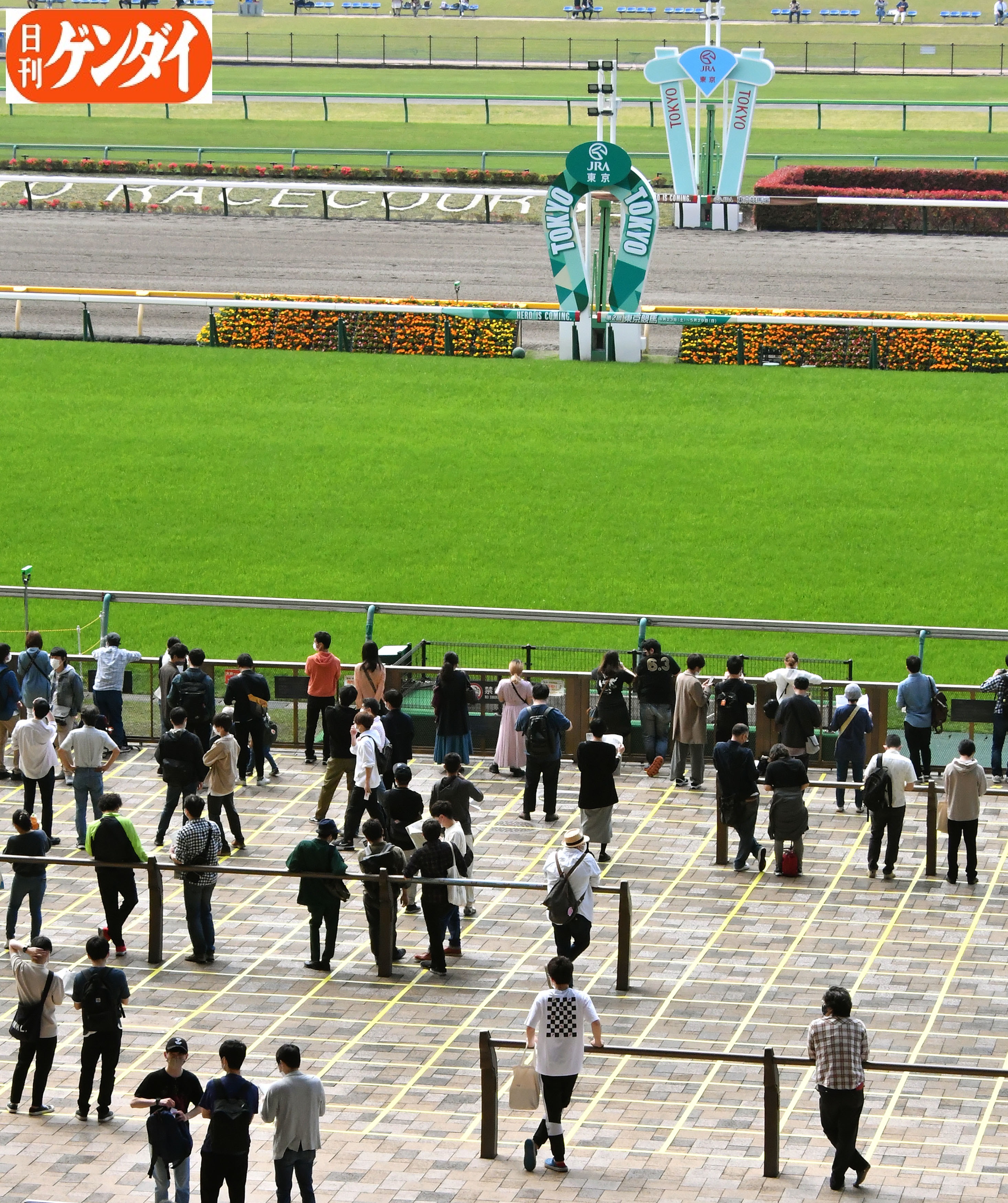 今週木曜、JRAより入場制限の緩和が発表された。それに伴い、ソーシャルディスタンスを取るために東京競馬場ではマスのマーキングが。