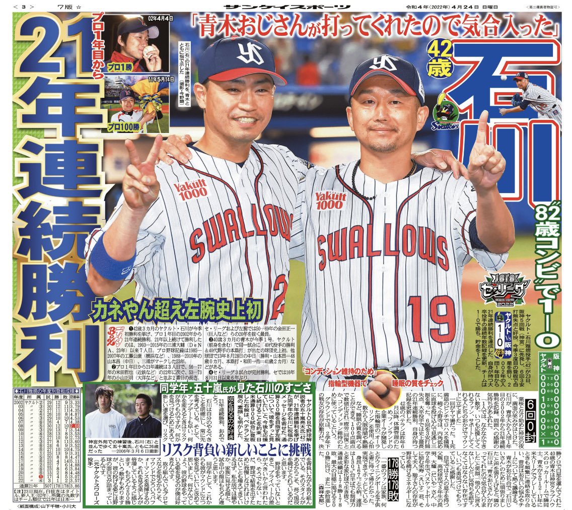 おはようございます☀本日の #サンスポ(東最終版、電子版)では、3面で #石川雅規 投手の21年連続勝利をお届け。V打を放った #青木おじさん こと #青木宣親 選手と📸さらに、同学年の #五十嵐亮太 氏も祝福のコメントを寄せています。