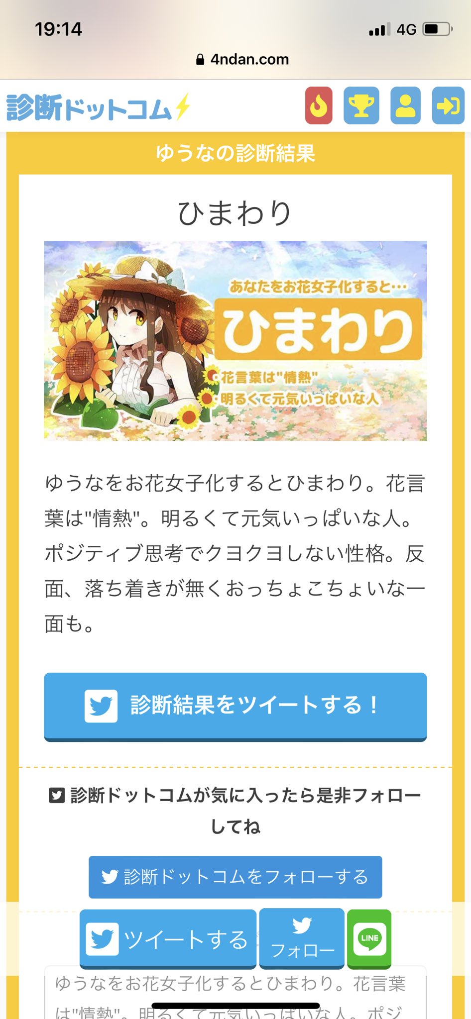 ゆうなをお花女子化するとひまわり。花言葉は"情熱"。明るくて元気いっぱいな人。ポジティブ思考でクヨクヨしない性格。反面、落ち着きが無くおっちょこちょいな一面も。