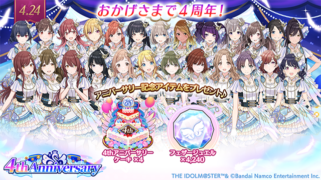 これを記念して、本日限定でゲーム内にログインしていただくと『4thアニバーサリーケーキ×4』と『フェザージュエル 4,240個』をプレゼントします♪