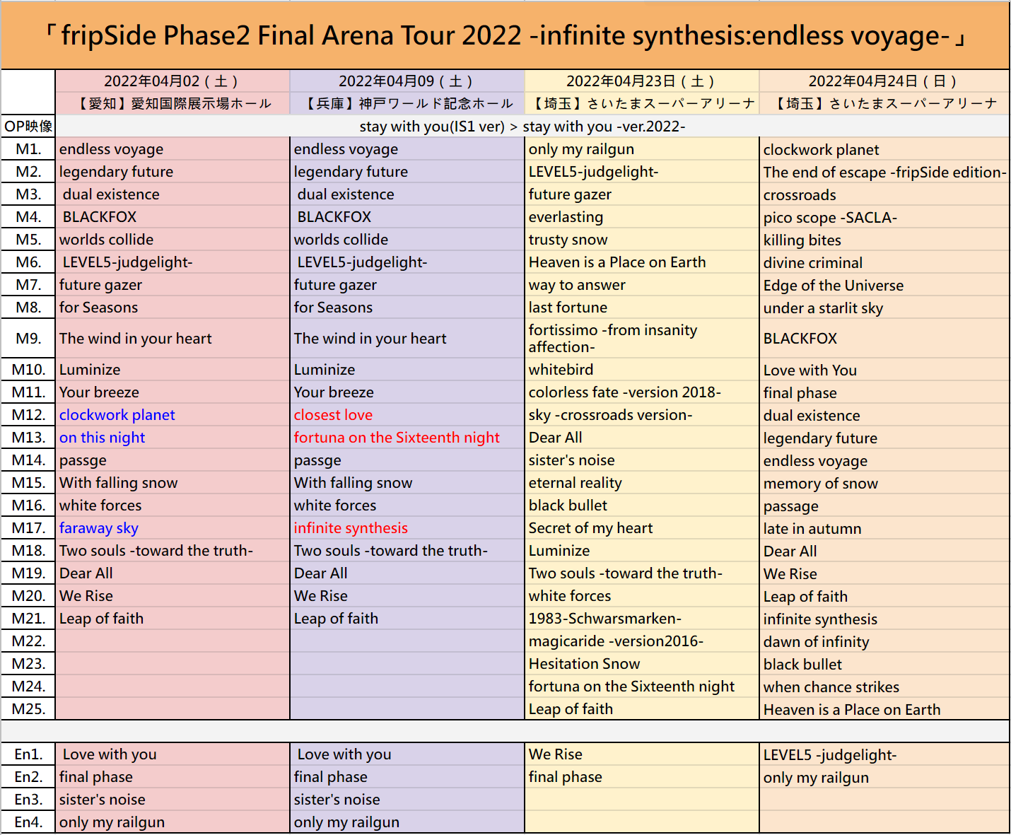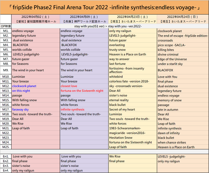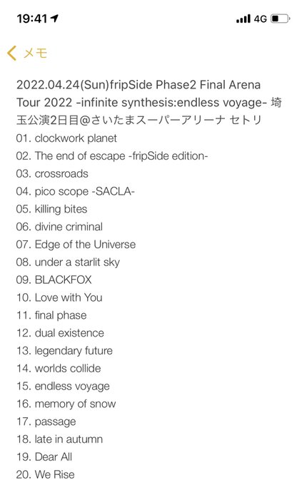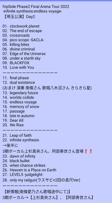 2022.04.24(Sun)fripSide Phase2 Final Arena Tour 2022 -infinite synthesis:endless voyage- 埼玉公演2日目@さいたまスーパーアリーナ セトリ