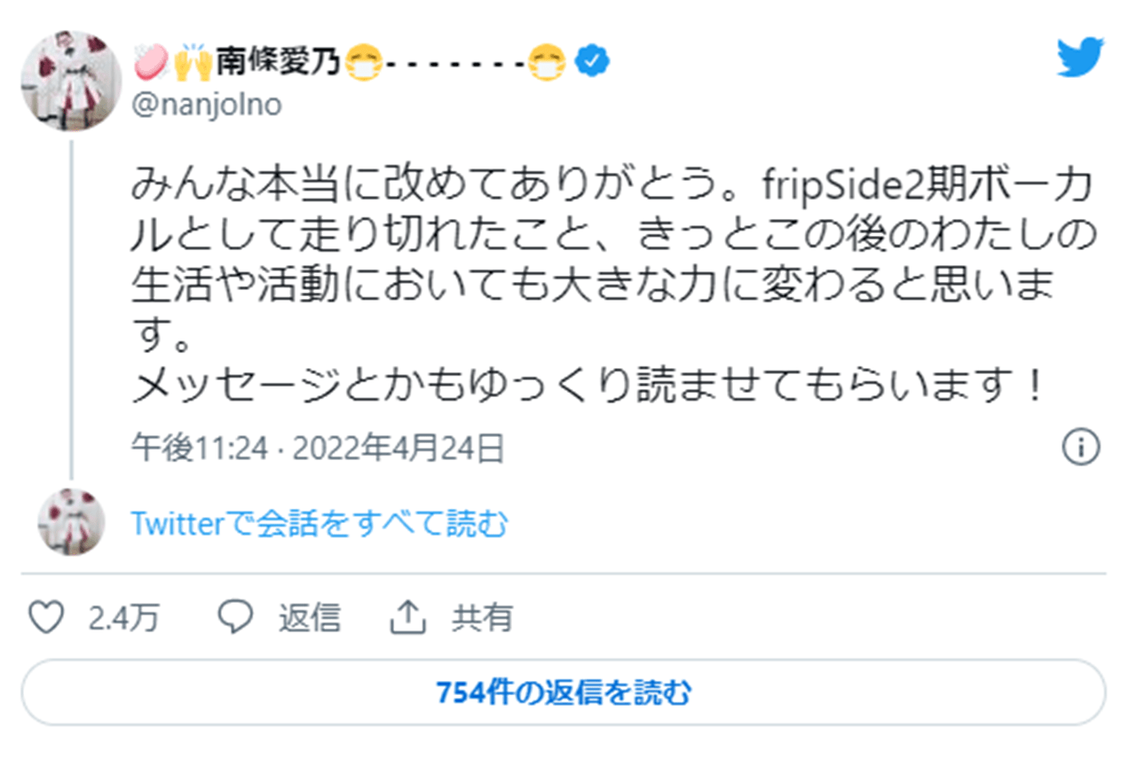 #fripSide のボーカル担当・ #南條愛乃 さんが卒業公演を終えて、感謝の言葉をツイート!