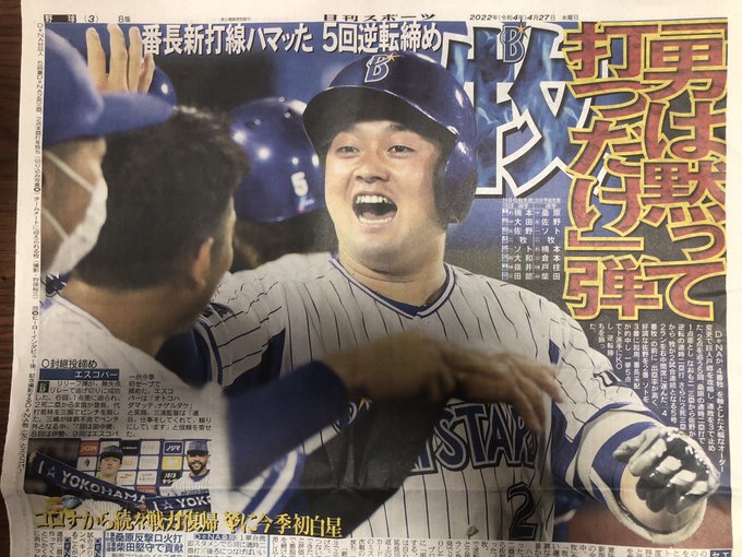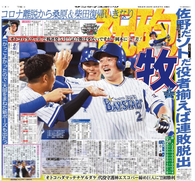 今朝のサンスポ(東)は、3面1ページ丸々もちろんフルカラーでベイスターズ🌟2試合連発の #牧秀悟 選手を中心に、連敗を止めたチームの奮闘を大きく掲載しています!!