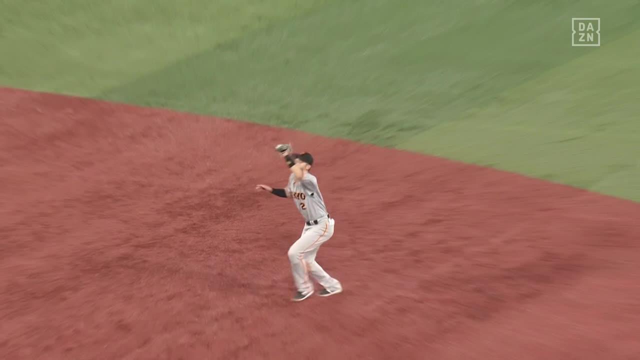 #岡本和真 選手が三塁線への痛烈なゴロをダイビングキャッチ‼素早い送球でアウトを奪い、無失点投球を続ける #メルセデス 投手を助ける👏