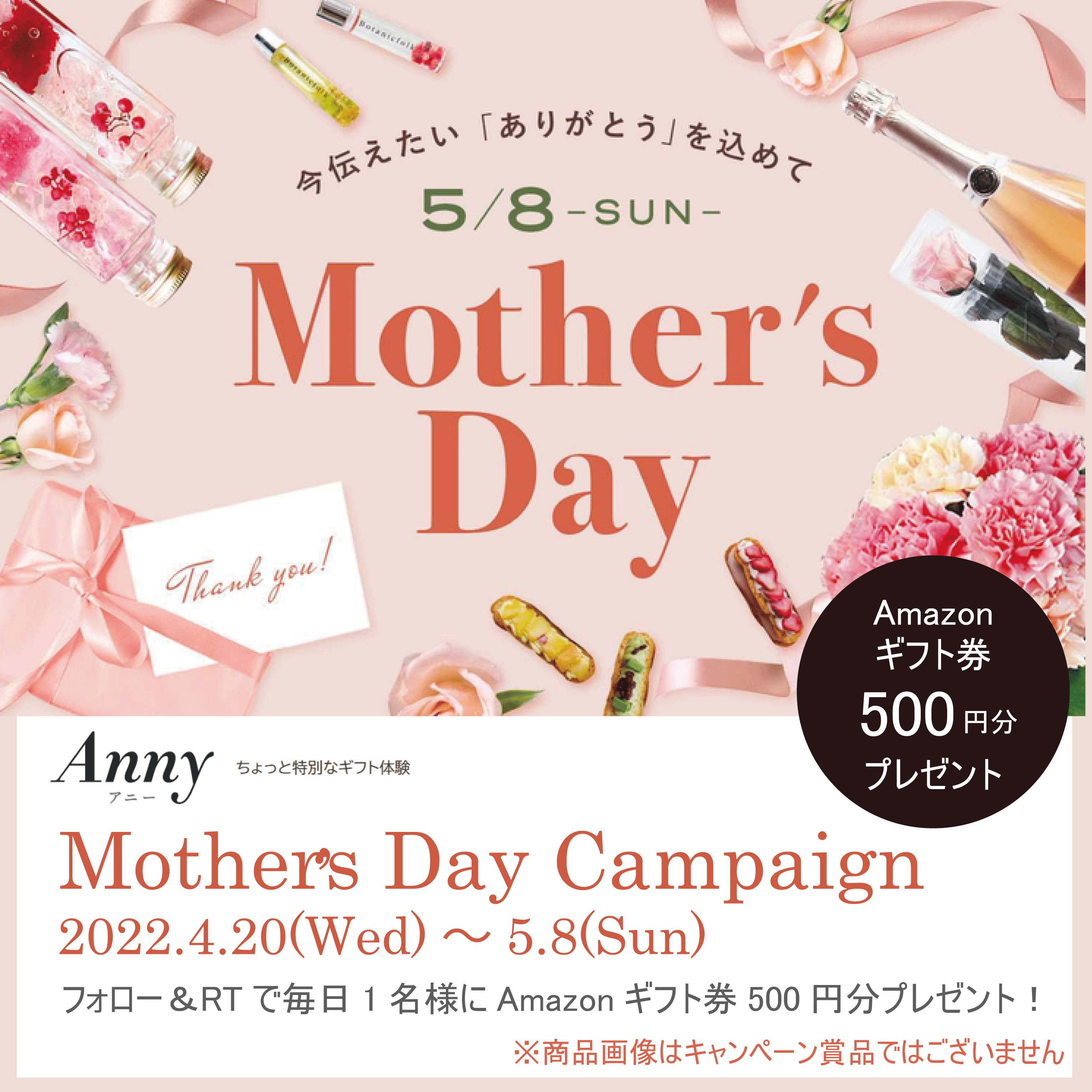 フォロー&RTで当たる! #anny母の日キャンペーン #Amazonギフト券 500円分が抽選で1名に当たります😊