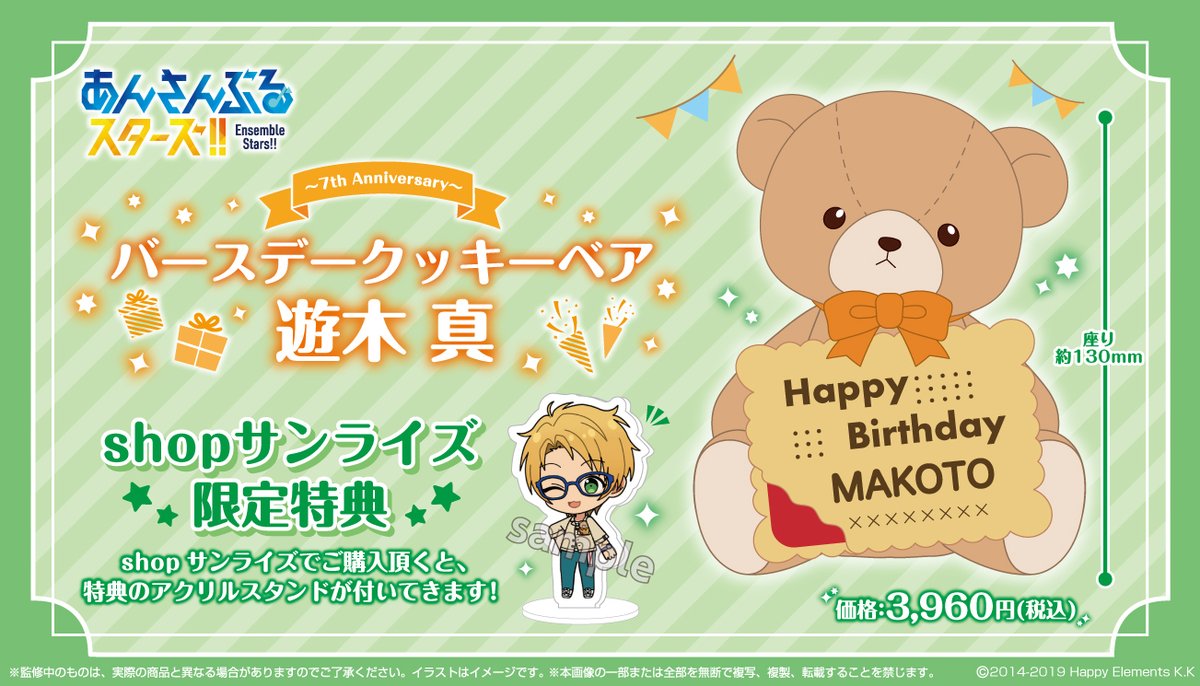 ゲーム「あんさんぶるスターズ!!」の「遊木 真」くんのバースデーベアの予約を開始させて頂きます!クッキー部分は立体的なラバー仕様です🎵