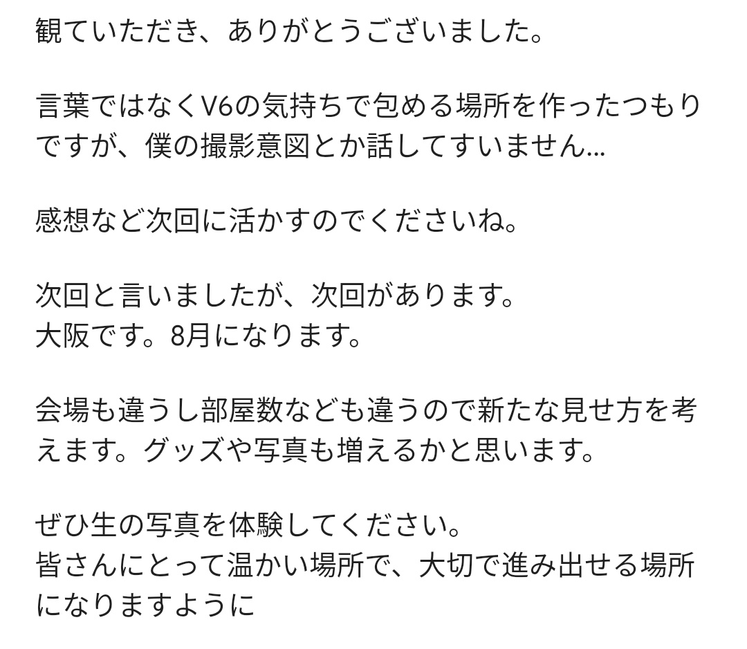 最後の最後まで撮り続けたV6の写真展を撮影者である岡田准一が解説しながら展示会場まわる配信が終わってしんみりしながらファンが感謝を述べてる爆速チャットに次回も新しく写真展あるよってお知らせしてくるV6