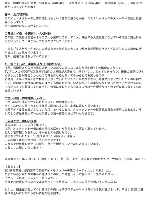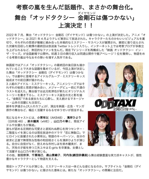 #オッドタクシー 舞台化決定!ミステリーキッス結成の光と影を、此元さん書き下ろし新作でお届けします。ホント面白いです。#小栗有以 #AKB48 #濱岸ひより #日向坂46 #鈴木瞳美 #山口乃々華 twitter.com/oddtaxi_/statu…