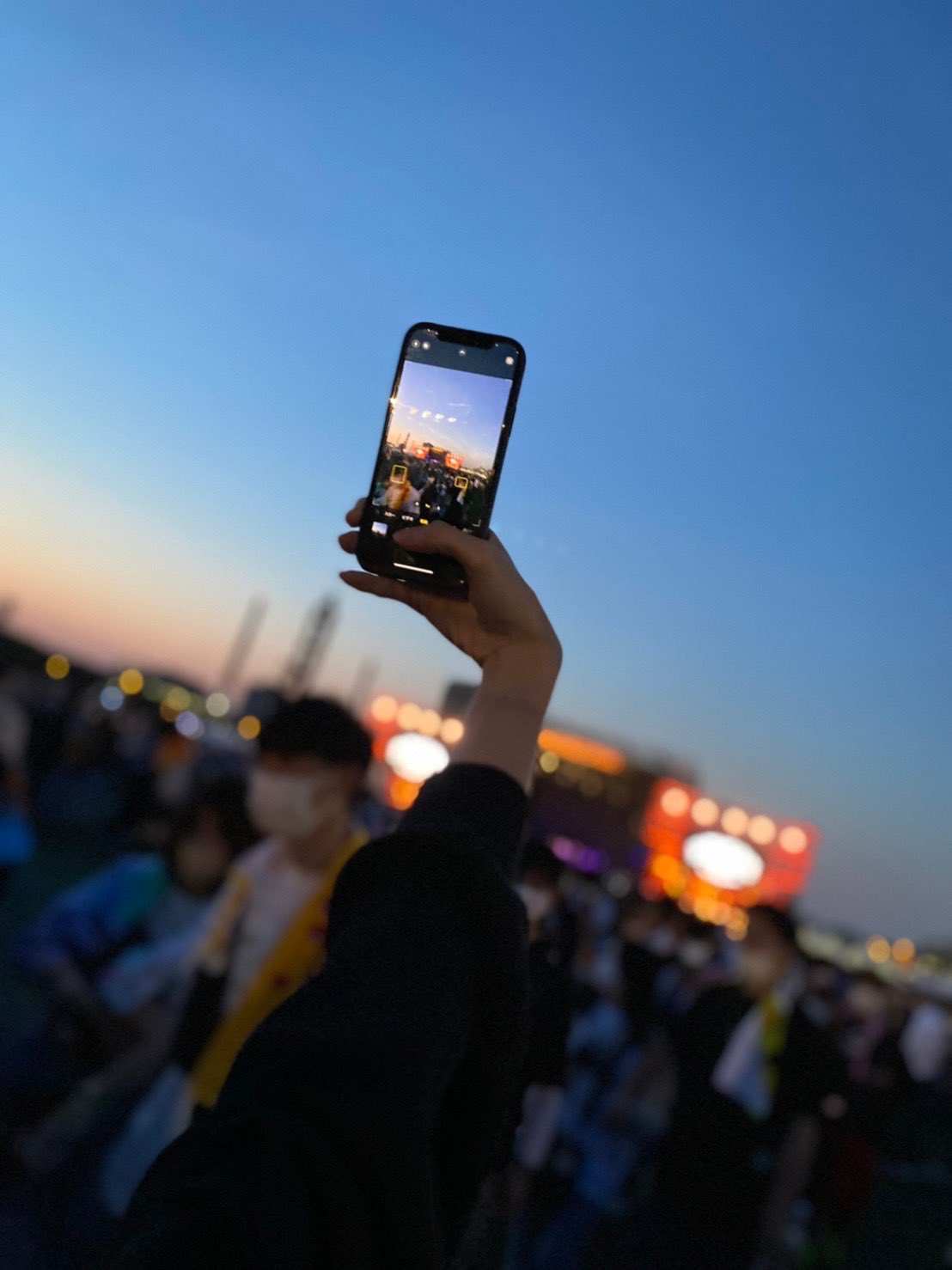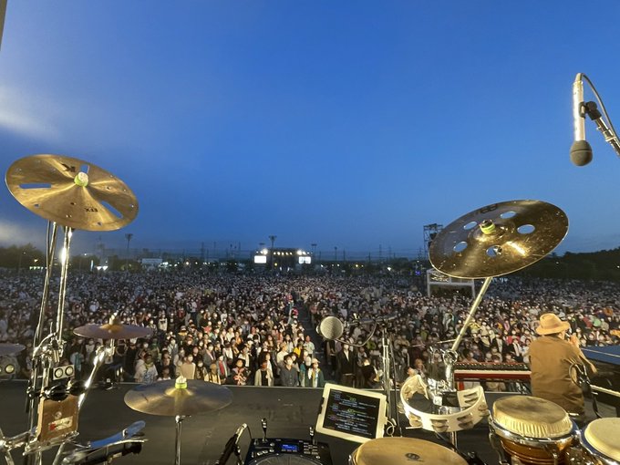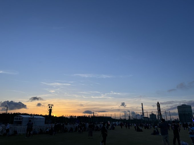 雨が上がった夕暮れ時、日が沈んでどんどん空の景色が変わる中、僕らのテンションもお客さんのテンションもどんどん上がっていき、最後は目の前に広がるものすごい数の拍手の波に感動しました!楽しかった〜🎶
