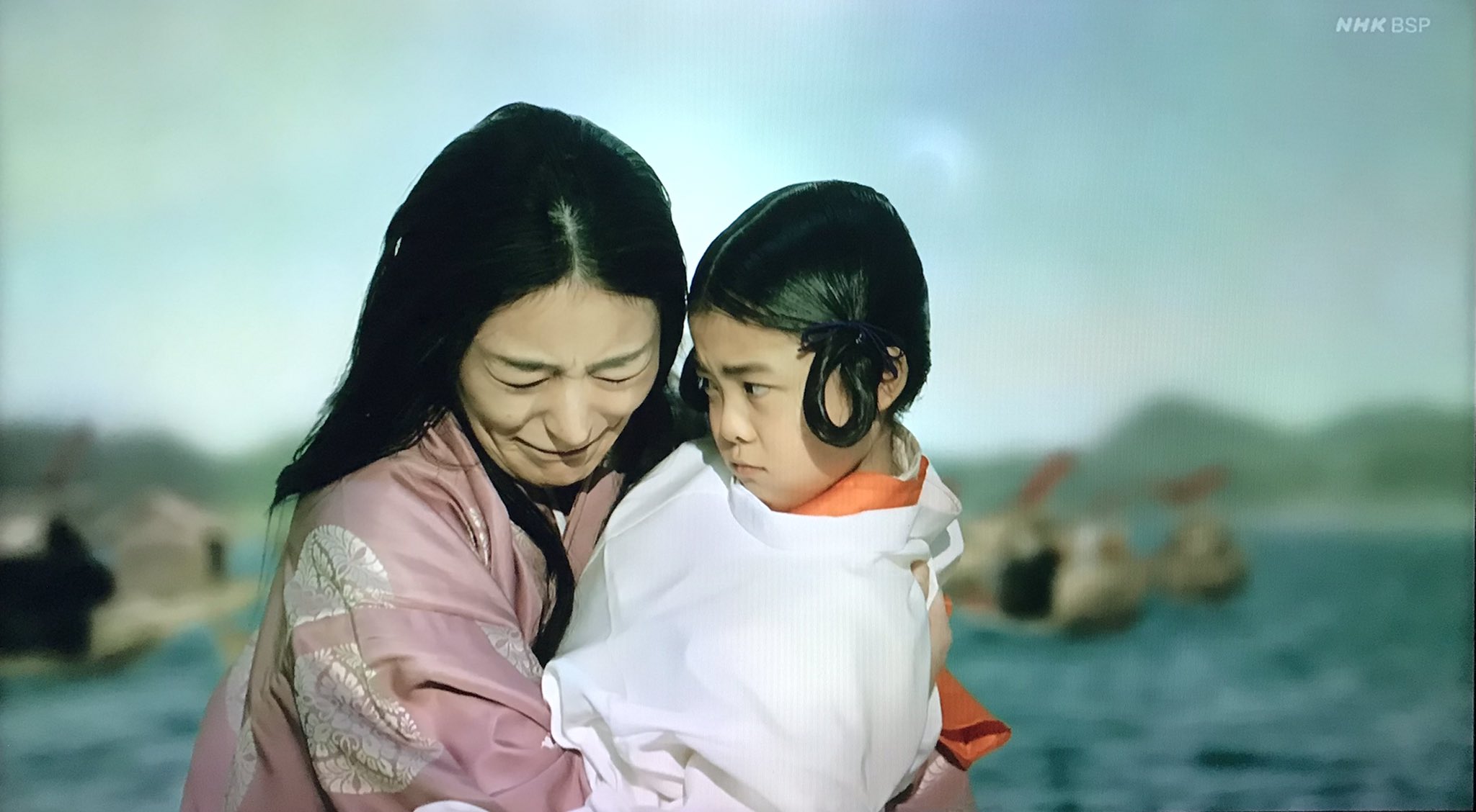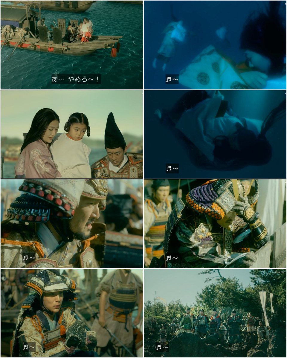 なるほど、「平家物語」だと、帝は東の伊勢と西の彼岸とを参らせて二位尼に抱かれて入水なんだけど、今年の壇ノ浦は鎌倉視点なので、「吾妻鏡」に忠実に行くんだねぇ(吾妻鏡だと安徳天皇は女官に抱かれて入水)。 #鎌倉殿の13人