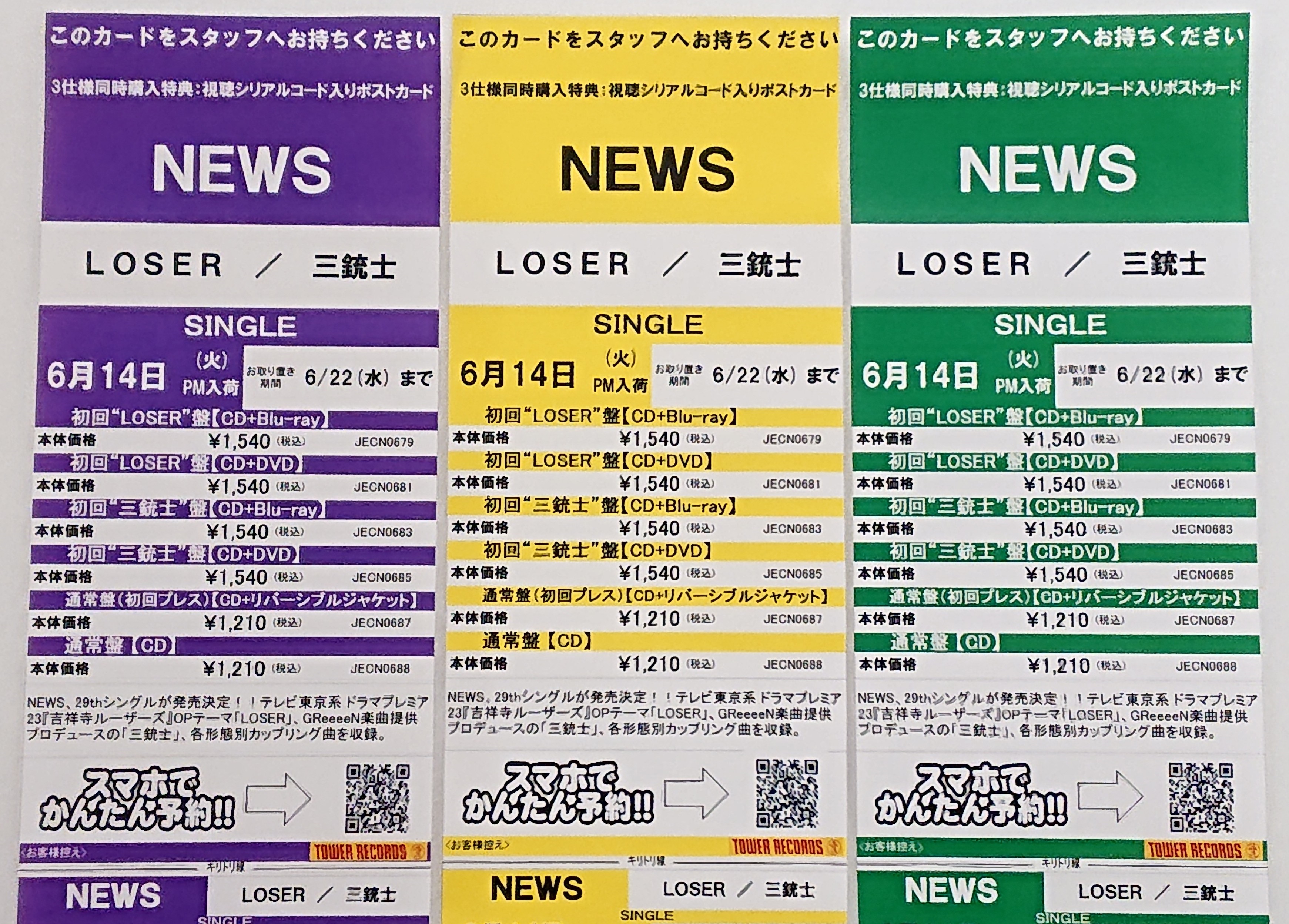 NEWSニューSG『LOSER / 三銃士』6月15日発売決定💜💛💚