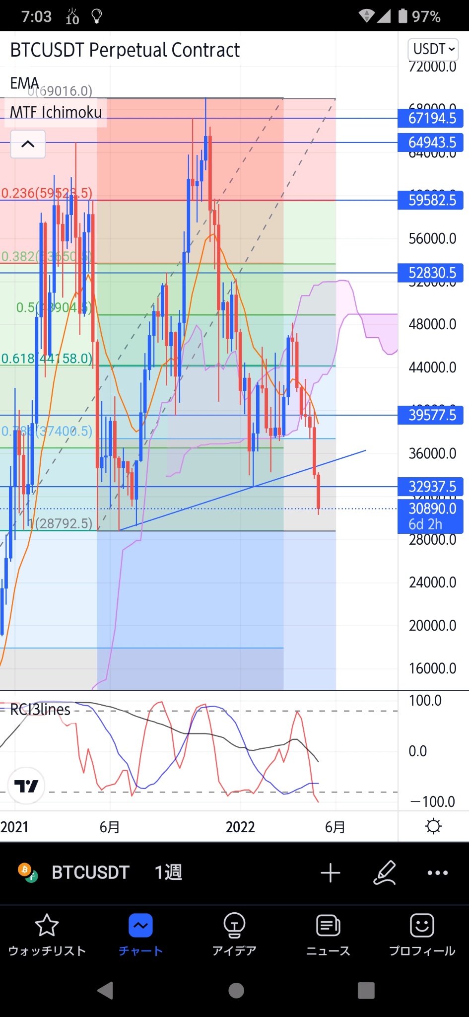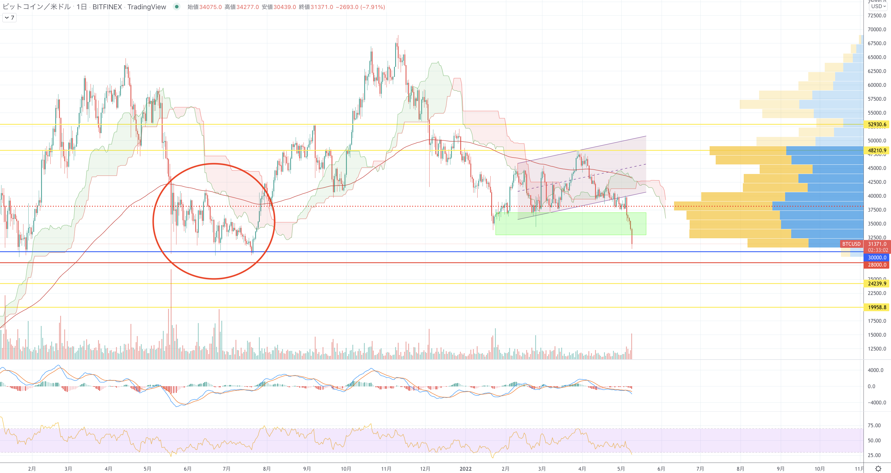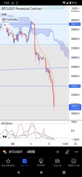 まだ下が強いですね。ロングは建値近くで切られてノーポジです。下のサポートとしてはキリの良いだけの弱いサポート$30000や、2021年6月の押し安値$28790程度です。$32940まで戻るなら戻り売りを狙う形になりそうで、間の位置ではまだポジションが持ちにくいと思います😇 pic.twitter.com/CaLto6LwKe