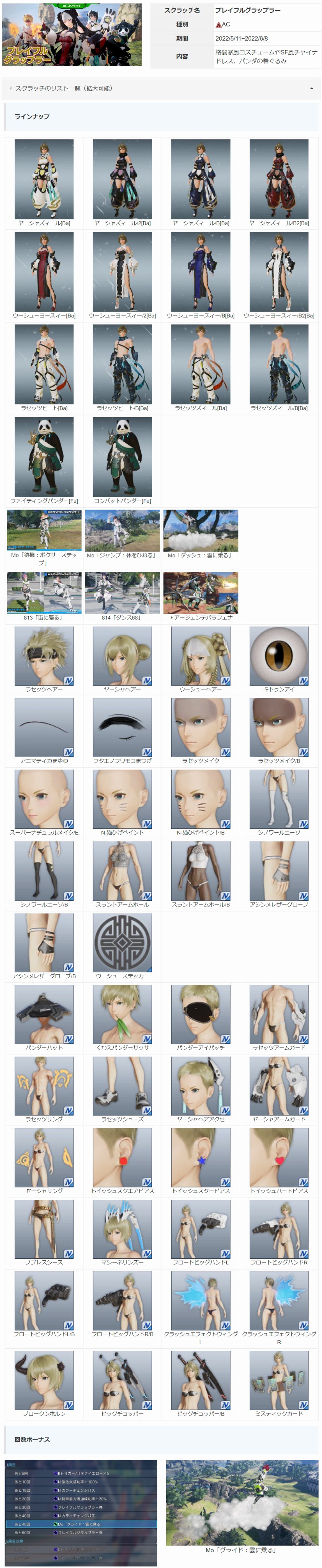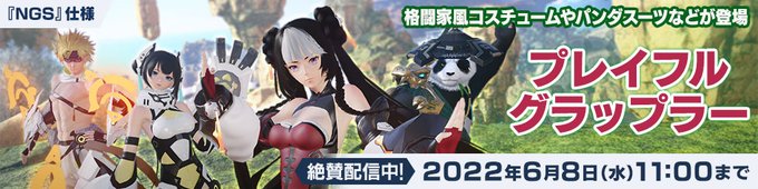 【5/11 ACスクラッチ情報】ACスクラッチ「プレイフルグラップラー」では、 格闘家風コスチュームやSF風チャイナドレスなどが登場!雲に乗るモーション変更アイテムや、パンダの衣装もあるぞ!詳細はこちら! pso2.jp/players/news/s… #NGS #PSO2NGS pic.twitter.com/QAbKJO2Fu4