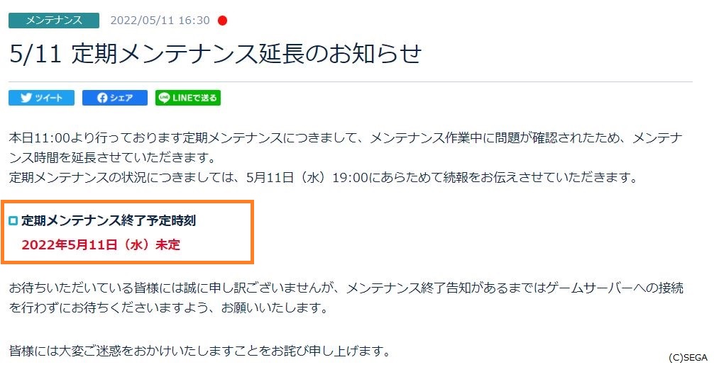 【5/11 定期メンテナンス延長】本日の定期メンテナンスにつきまして、メンテナンス中に問題が確認されたため、メンテナンス時間を延長させていただきます。皆様には大変ご迷惑をおかけいたしますことをお詫び申し上げます。 pso2.jp/players/news/2… #PSO2NGS #NGS