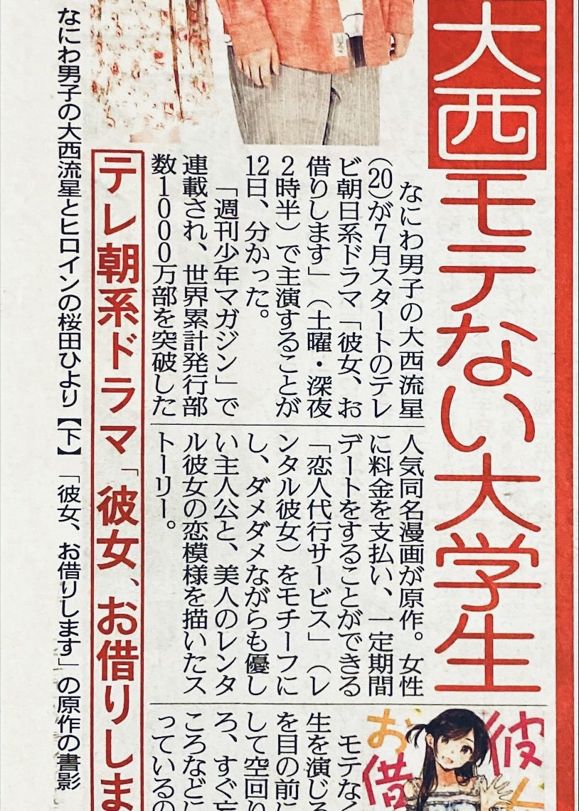 #なにわ男子 の #大西流星 ✨が7月スタートのテレビドラマ「彼女、お借りします」で主演‼️世界累計発行部数1000万部突破の人気同名漫画が原作😀