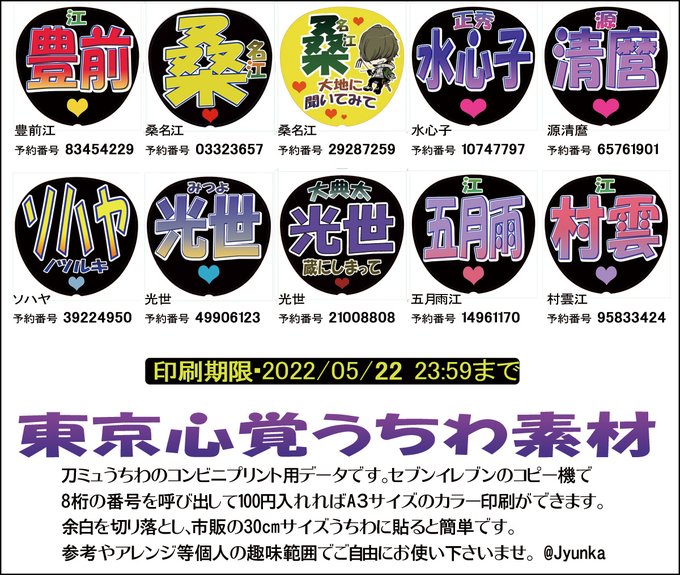 らぶフェスなので再UP。以前作った出陣刀剣男士うちわ(東京心覚組)セブンコピー機でプリント→ネットプリント→8桁の予約番号、A3カラー(コピー代100円)余白を切り取るとうちわサイズ。個人の趣味範囲内でご自由にお使い下さい。視認性はあまり良くありませんが賑やかしに。#真剣乱舞祭2022 pic.twitter.com/hT2lhIrzvb