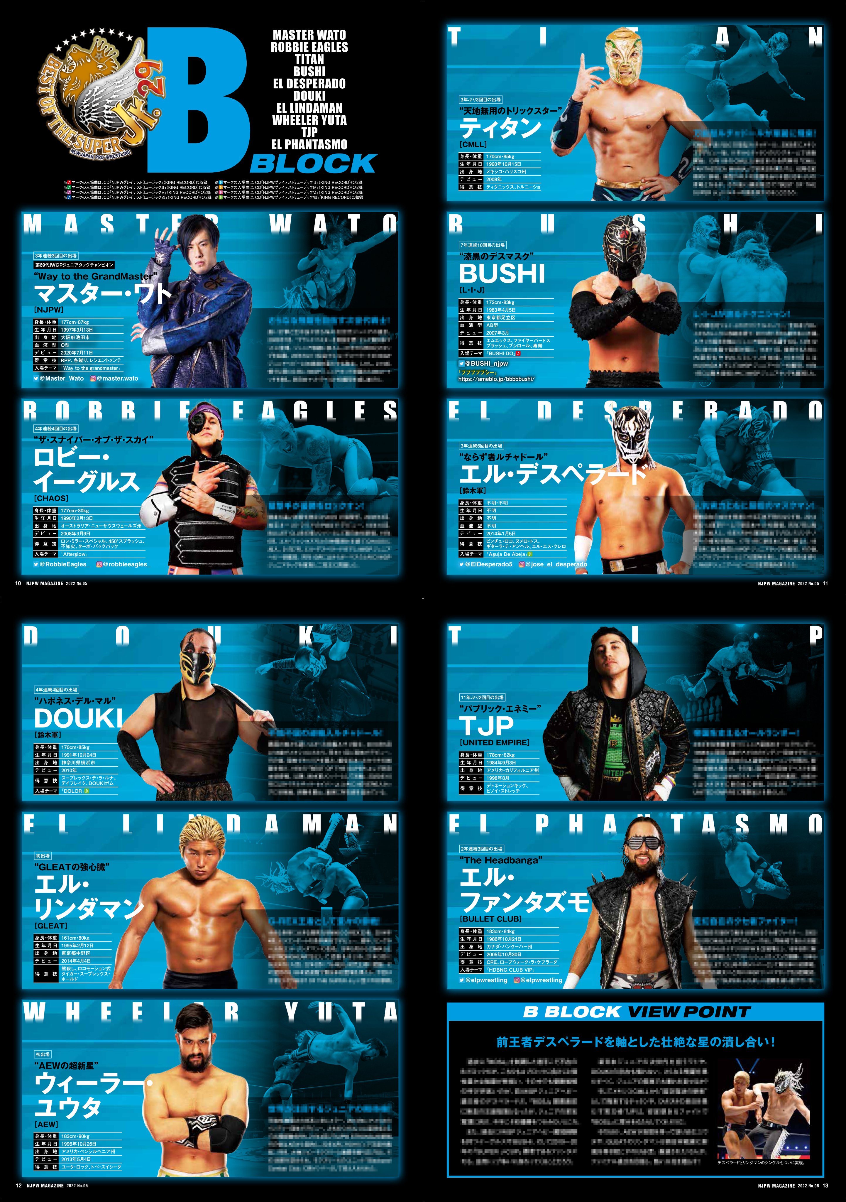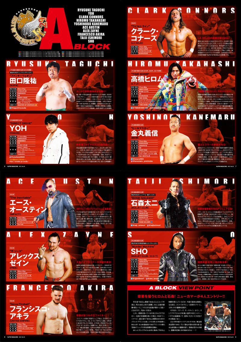 本日開幕の『BEST OF THE SUPER Jr.29』パンフ誌面紹介。インタビューにはAブロックから石森選手、Bはデスペラード選手が登場。各公式戦への意気込みを中心に伺っています。各出場選手の紹介ページ含め、『BOSJ』をより堪能できる一冊を記念にぜひ!
