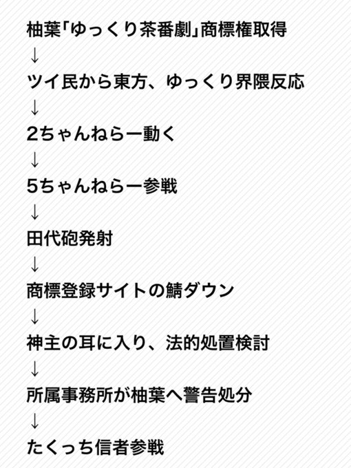 いいですか、落ち着いて聞いてください。あなたが眠っていた30時間の間で柚葉がゆっくり茶番劇を商標登録し、田代砲が発射され特許庁の鯖が陥落し、神主がこの件を把握、柚葉の所属事務所が警告処分、たくっち、ひろゆき、岡野タケシ弁護士が参戦し、Wikipediaにページが作られました。
