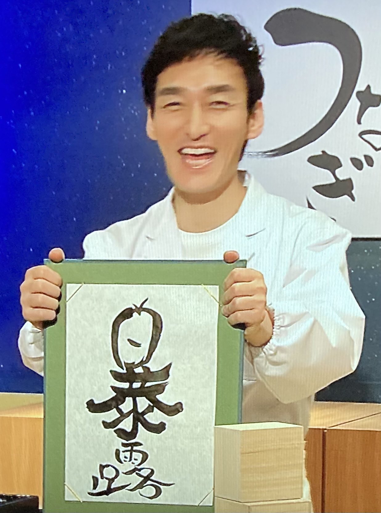 【暴露】をフルーツに見立てたツヨシさんと、おにぎりに見立てたシンゴさん。勝者はツヨシさんでした!!まだ見られていない方もいらっしゃると思うのでお二人の作品はおそワルの放送の際に公開いたします。