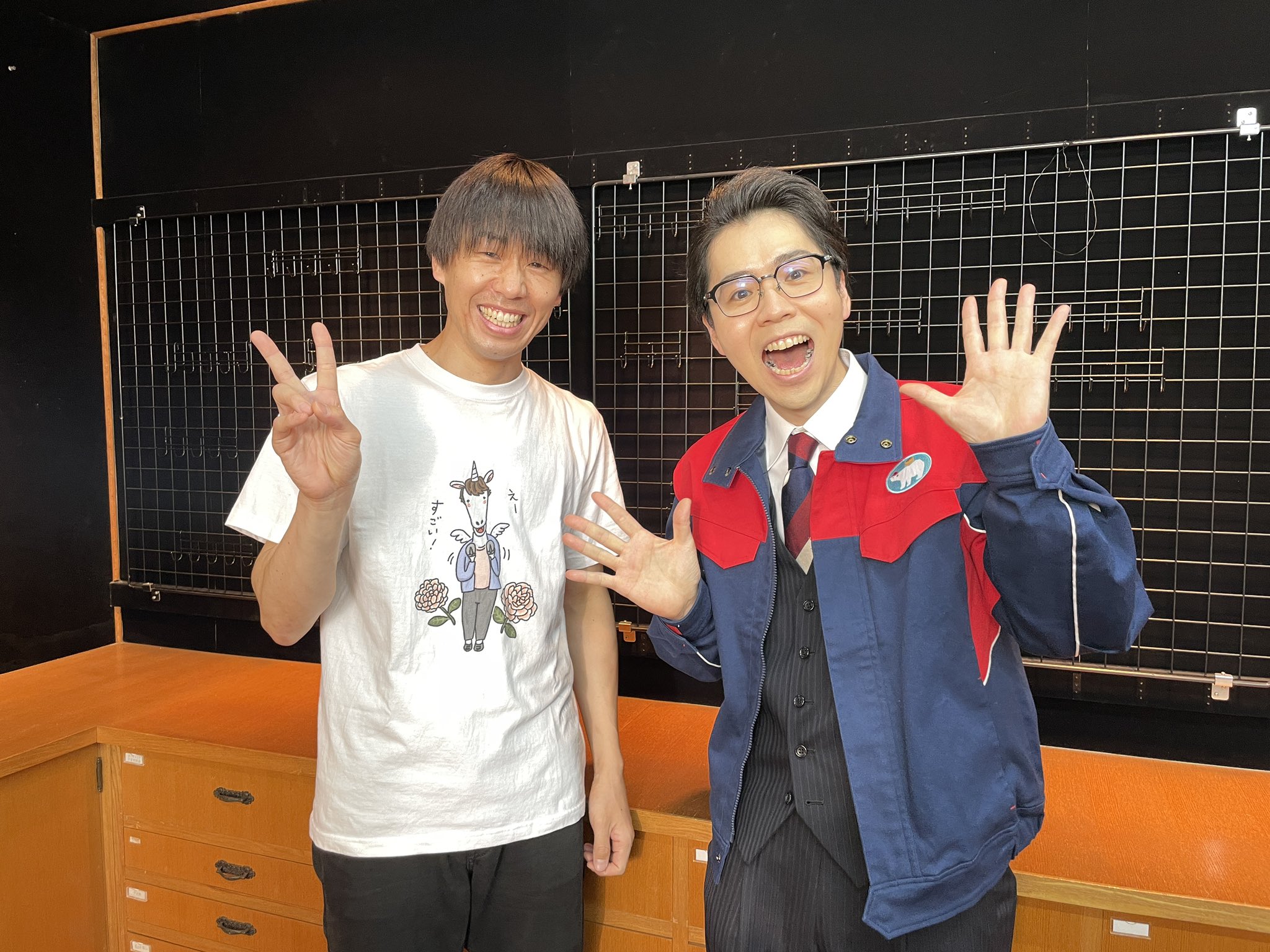 現場で一緒だった浅井宏輔さん。撮影スケジュールを見てわざわざペガ井さんTシャツを着て来てくれたんです。お昼食べてきたんです〜と弁当を食べなかった浅井さんですが、合間で甘いお菓子をつまんでたのはしっかり見ましたよ👀