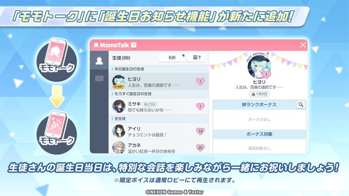 昨日のアップデートにて、「モモトーク」に「誕生日お知らせ機能」が追加されました!