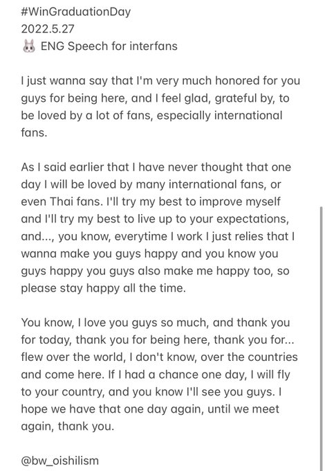 Winくんの #WinGraduationDay ステージでのinterfanに向けた英語スピーチがあまりにも尊くて泣けるので和訳しました🙏😇✨