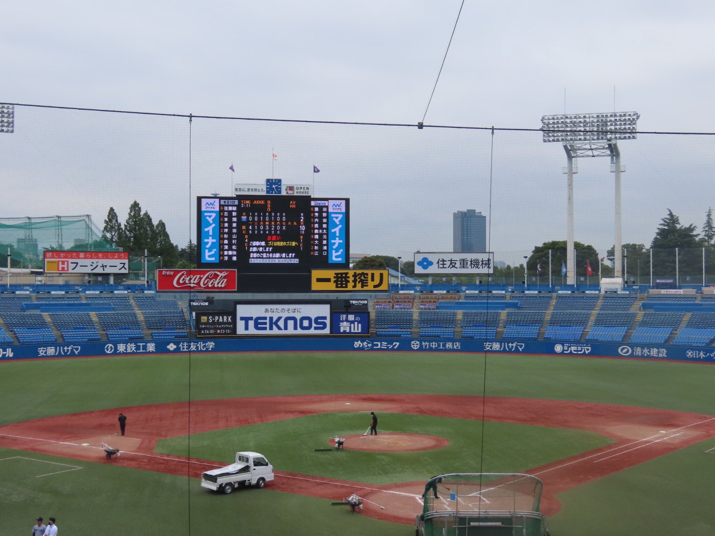 神宮球場は曇り☁️気温20℃で湿度88%とジメジメしていますが、雨は降っていません。今日は東京六大学野球の新人戦、いわゆるフレッシュトーナメントが行われていた為、14時過ぎに #山田哲人 らスワローズの選手が室内練習場へ。