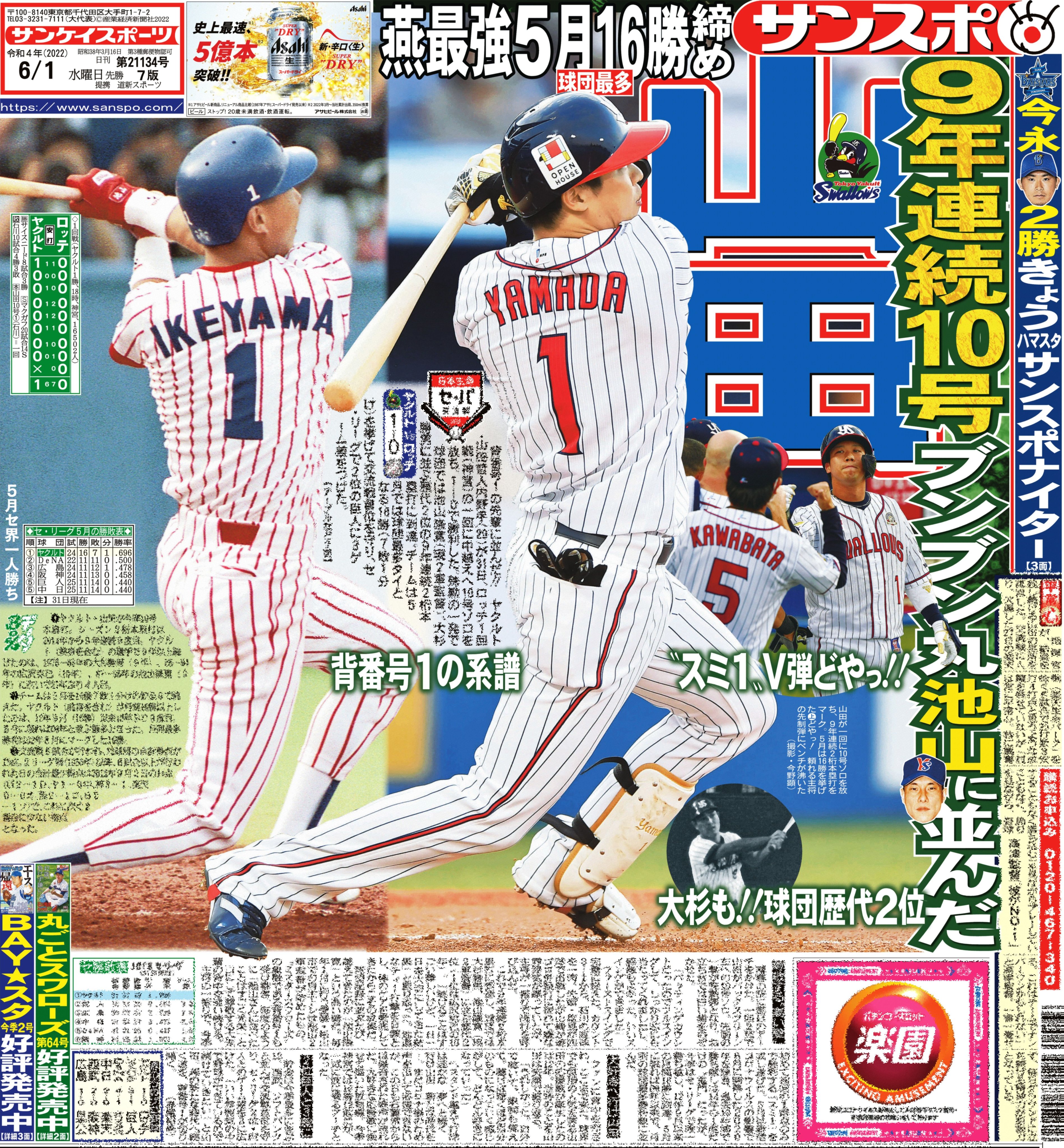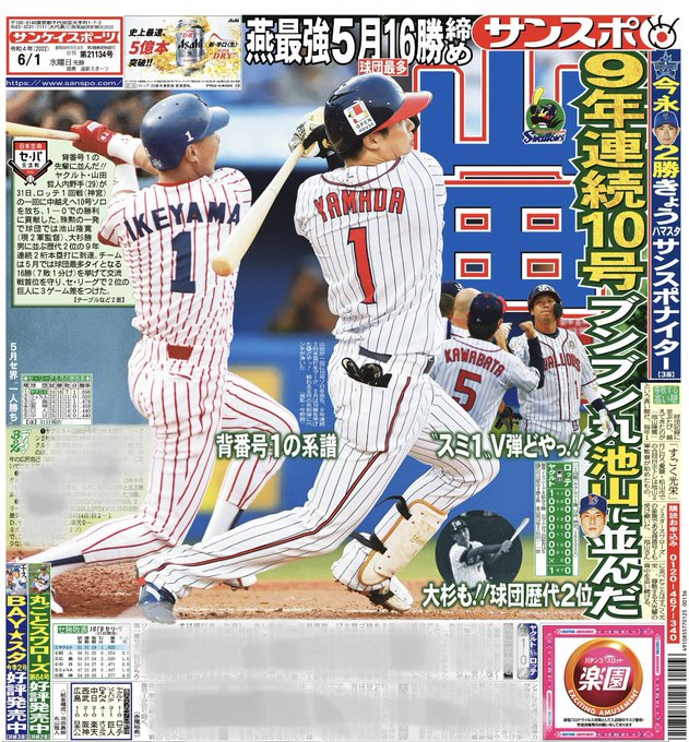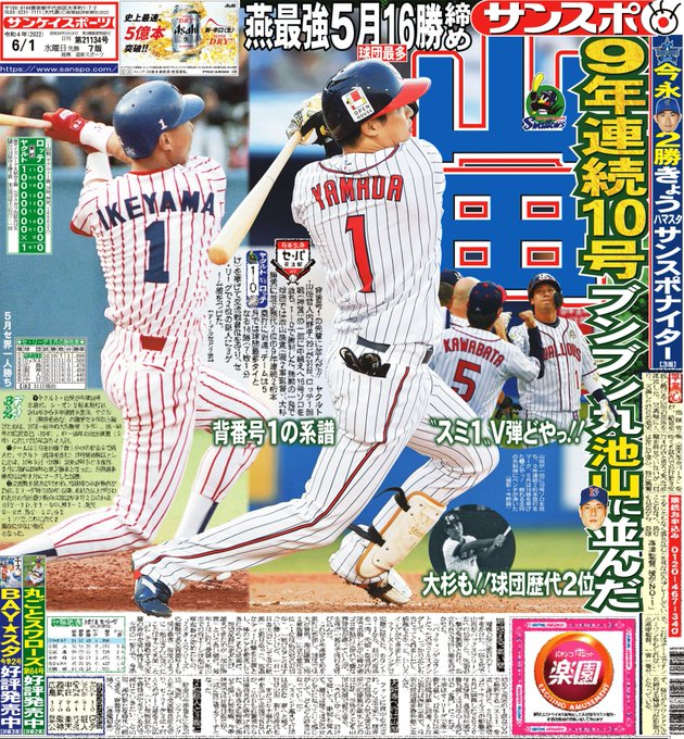 おはようございます☀本日の #サンスポ(東最終版、電子版)では、1面に #山田哲人 選手!球団歴代2位の9年連続2桁本塁打に到達。#大杉勝男、#池山隆寛 のレジェンド2人に並びました。大好きな応援歌に乗せて"スミ1"の勝利に導く一発!5月は16勝と勢いよく6月へ!