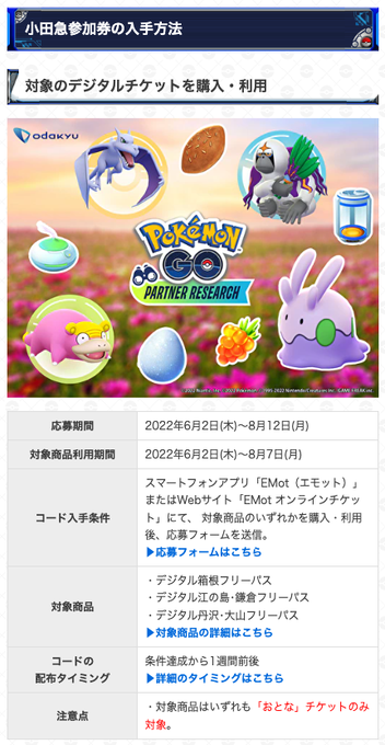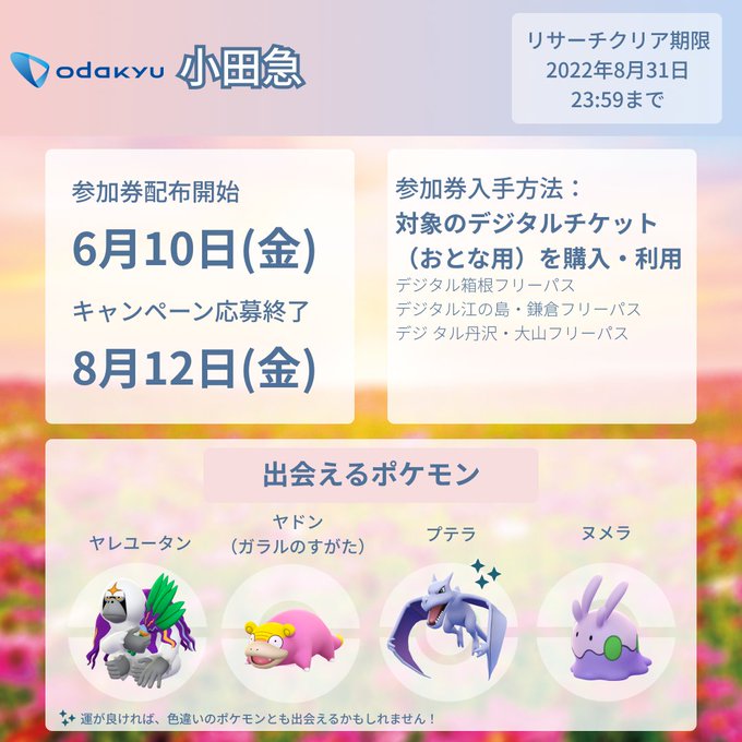 #ポケモンGO 公式パートナーで獲得した参加券でチャレンジできる「パートナーリサーチ」を「シーズンオブGO」でも開催します!本日から「小田急」の参加券がゲットできます。その他の参加パートナーの情報は順次公開予定です。