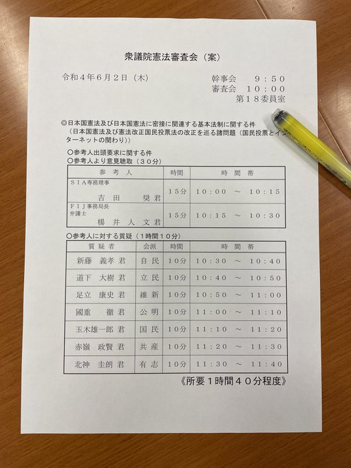 10時から憲法審査会が開催されます。本日は国民投票法に係るインターネット規制に関して、インターネット事業者の皆さんからお話を伺います。それを受けて各党それぞれ10分ずつ質問します。私は11時10分ごろから。
