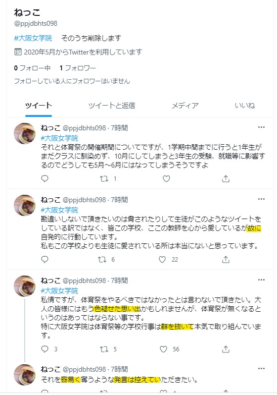 『大阪女学院の生徒です』とツイートしているかたが多数いるが、全員この事件からツイートを始めており、書き方や言葉遣いも似ており、50代くらいではないかな、、、全員、学校をかばう内容。続く