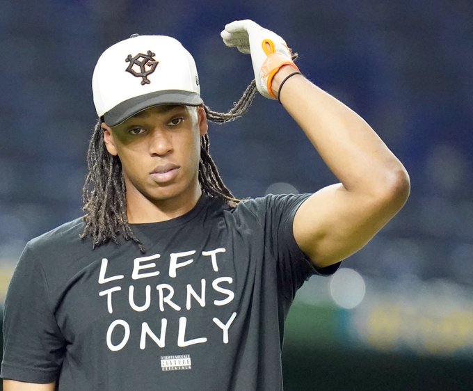 #ウォーカー 選手のTシャツは今日も「LEFT TURNS ONLY」。4試合連続のダイヤモンド1周に期待です🔥(撮影・斎藤浩一) pic.twitter.com/9Mtz5slFqC