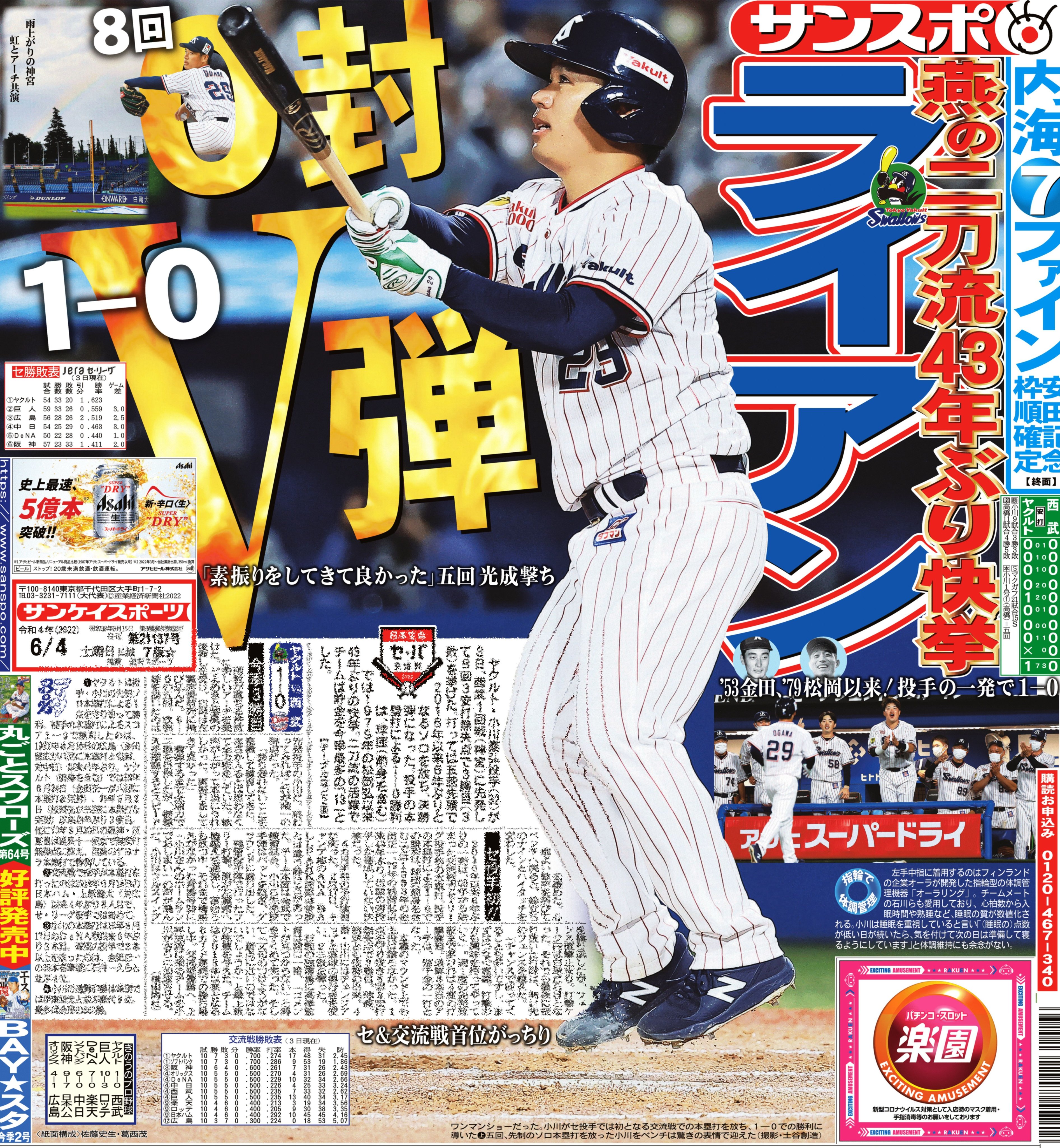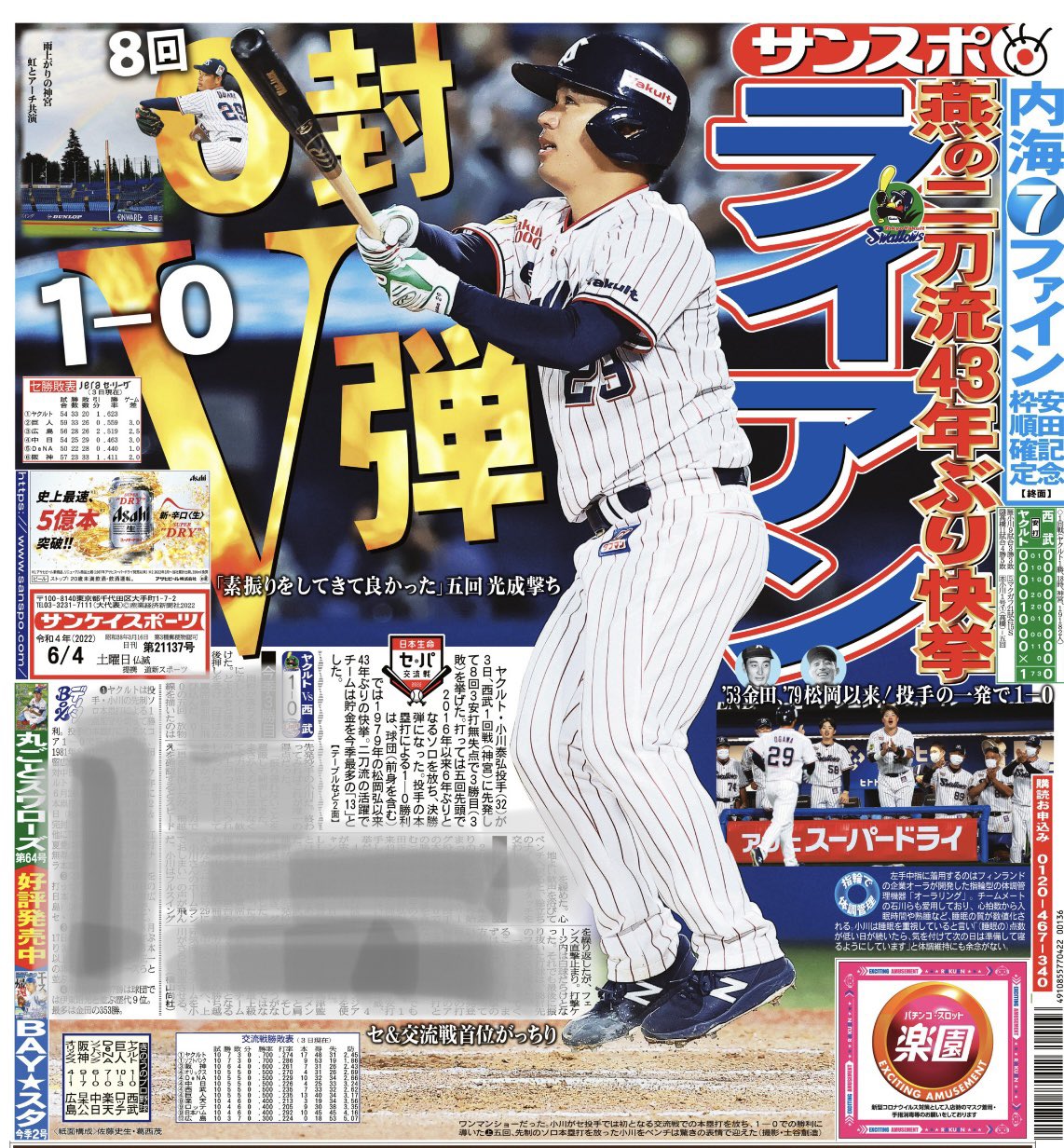 おはようございます☀本日の #サンスポ(東最終版、電子版)1面の見出しはもちろん!「#ライアン」。先発の #小川泰弘 投手が投げては8回0封、打っては決勝アーチ🌈二刀流の活躍で西武相手にカード初戦勝利に導きました!本日も勢いに乗って勝つ!