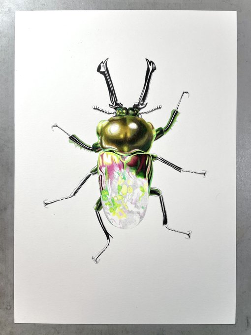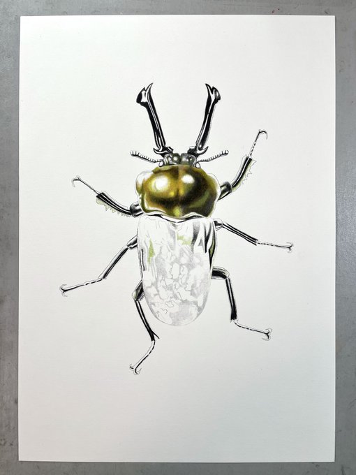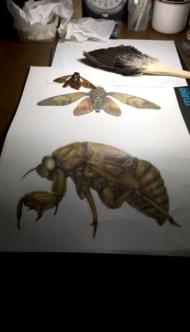 色鉛筆画を始めて3ヶ月たった頃はじめて描いた虫。だいすきなアブラゼミ。アブラゼミの亡骸をひろってきて湯でふやかし翅をひろげて観察した。その頃は亡骸から腹側の雄雌の違いをスケッチしたり外で木にとまってる蝉の行動の一部始終を追っかけてスケッチしたりして楽しかった。 #色鉛筆画 #虫の日 pic.twitter.com/o7JrwmUoRM