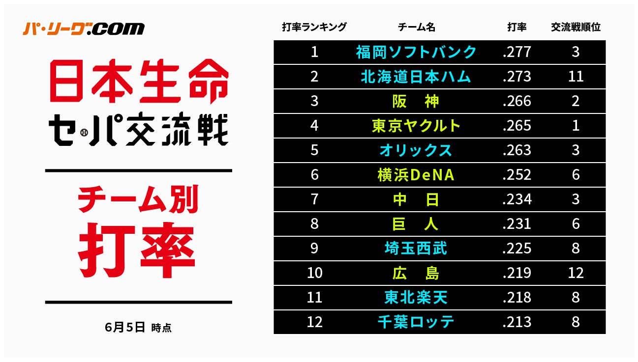 ✅チーム別打率成績(6月5日時点)