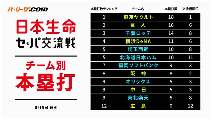 ✅チーム別本塁打成績(6月5日時点)