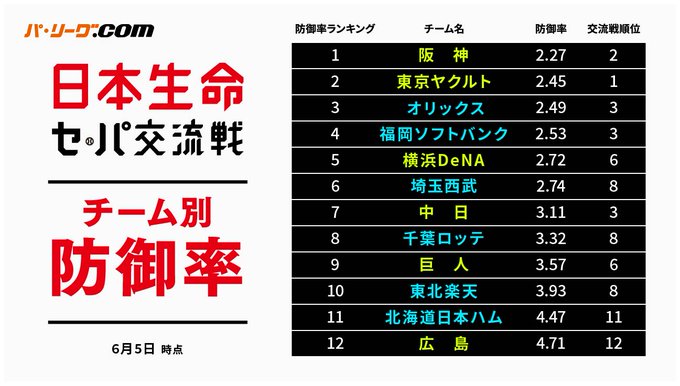 ✅チーム別防御率成績(6月5日時点)
