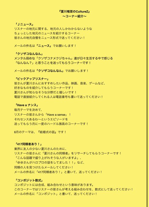 『ピックアップリスナー』や、『Jニュース』、『コンポジット数式』など、各コーナーへのメール募集中です!