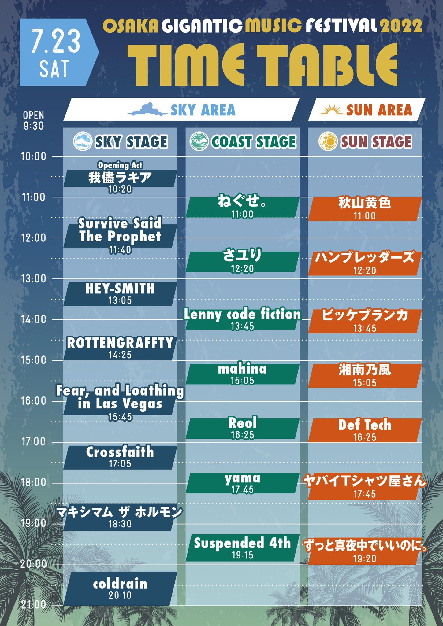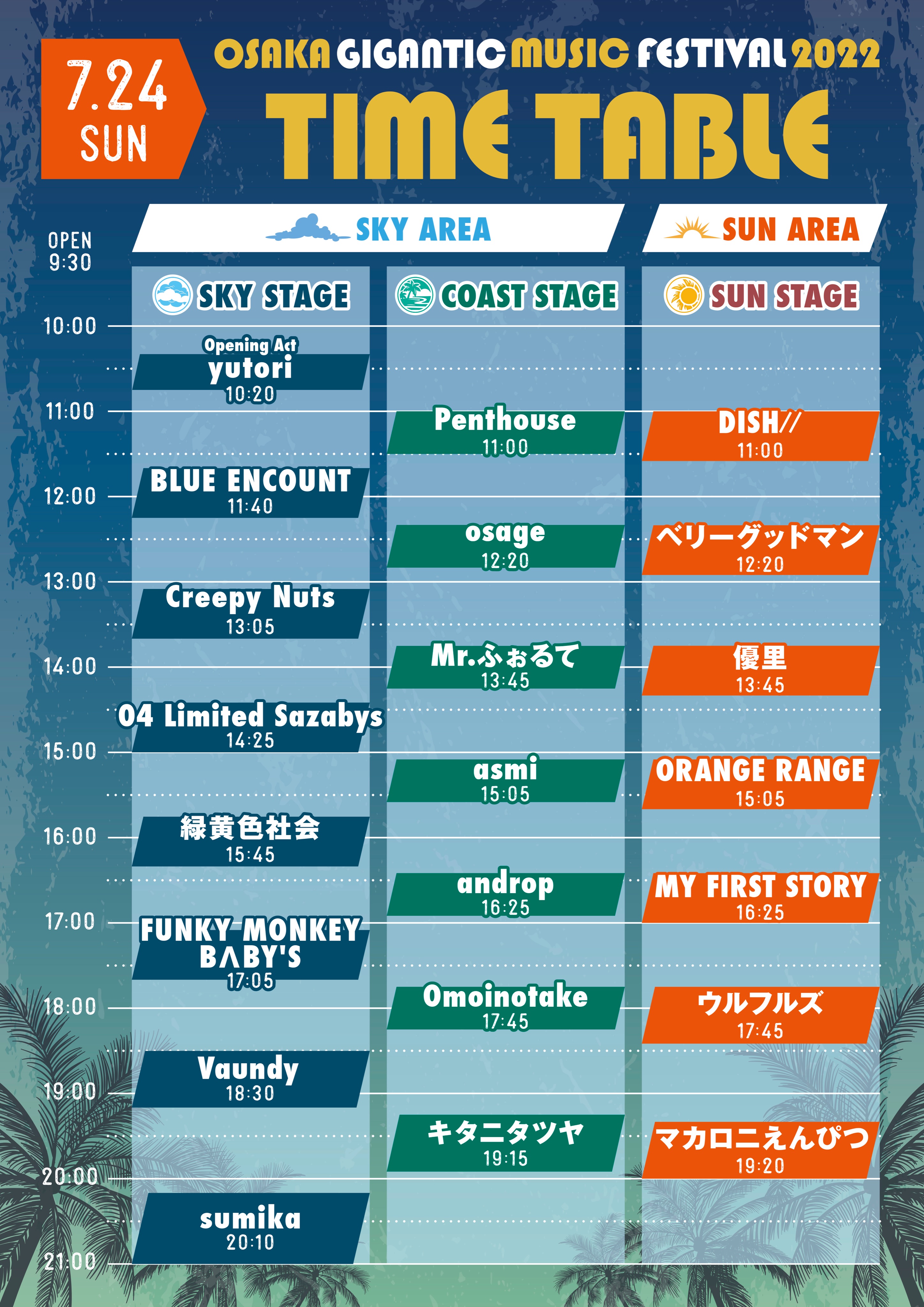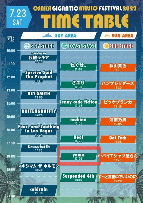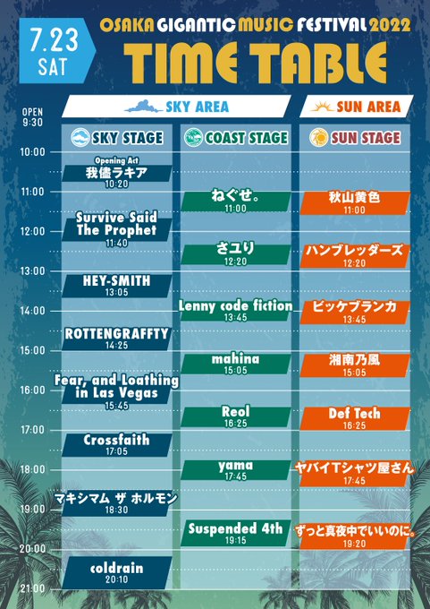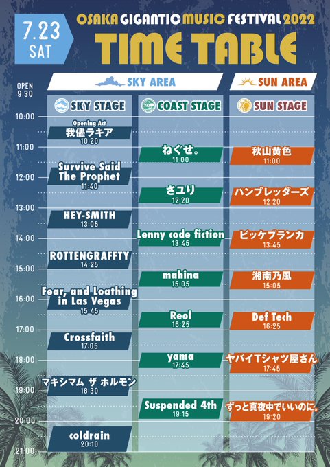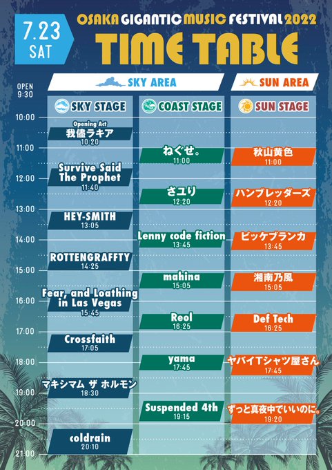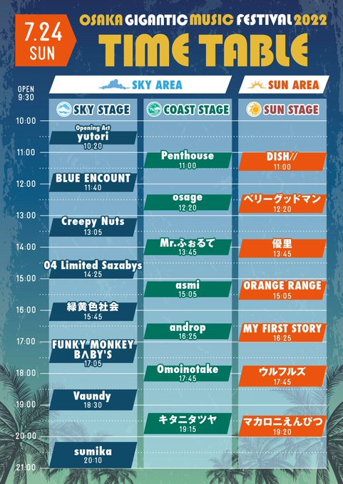 7/23(土)大阪・舞洲スポーツアイランドで開催される「OSAKA GIGANTIC MUSIC FESTIVAL2022」のタイムテーブルが発表になりました!