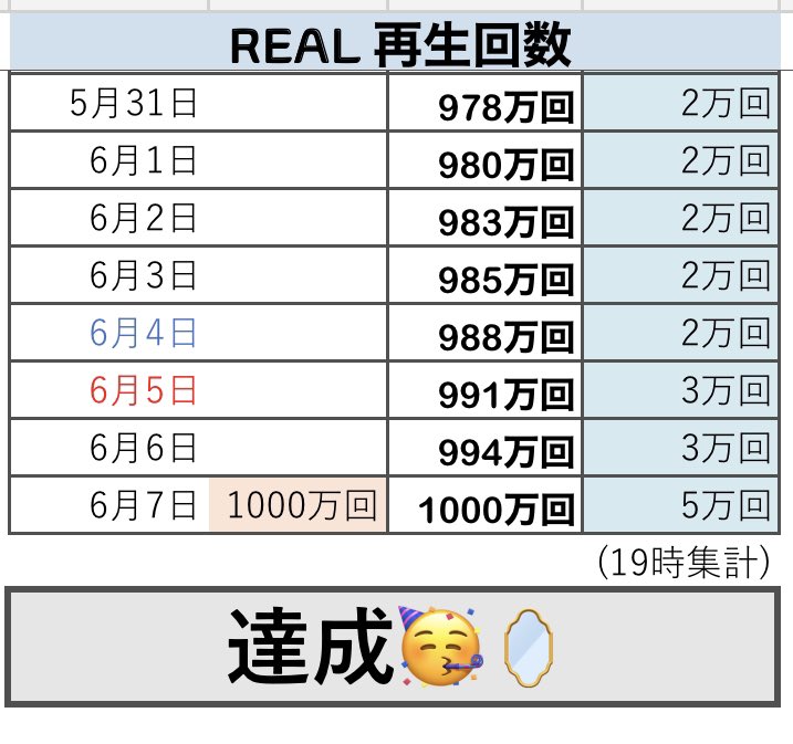先程帰宅して REAL 回したところ1,002万を超えていたのを見て泣いています。嬉しい!本当に嬉しい!いっぱい回してくれた皆さま、本当にありがとうございました!お疲れ様でした!