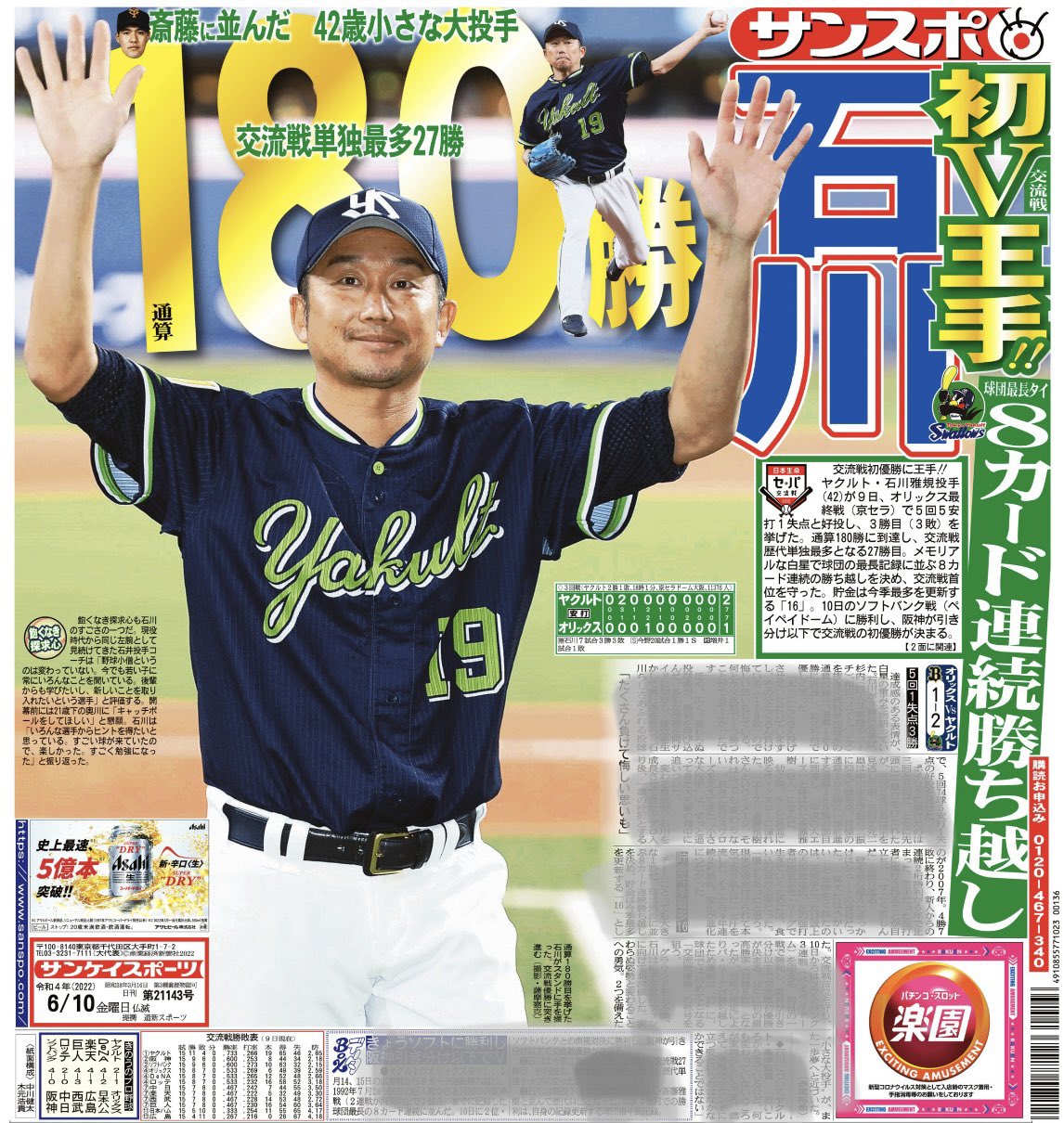 おはようございます☀本日の #サンスポ(東最終版、電子版)の1面は、#石川雅規 投手!小さな大投手が節目の180勝、交流戦単独最多の通算27勝目に到達。チームは最長に並ぶ8カード連続勝ち越し。きょうにも「交流戦優勝」の称号を手にする可能性も。
