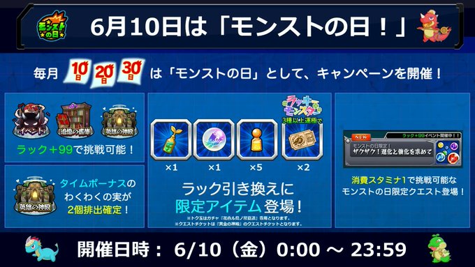 開催されるキャンペーンや、「ラック引き換え」に登場するモンストの日限定アイテムは画像をチェック✨