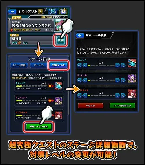 「対策レベル」を上げると、道中の「マゴスチーネ」「ギスイッカ」「ドリアンディ」へ与えるダメージが上昇💥