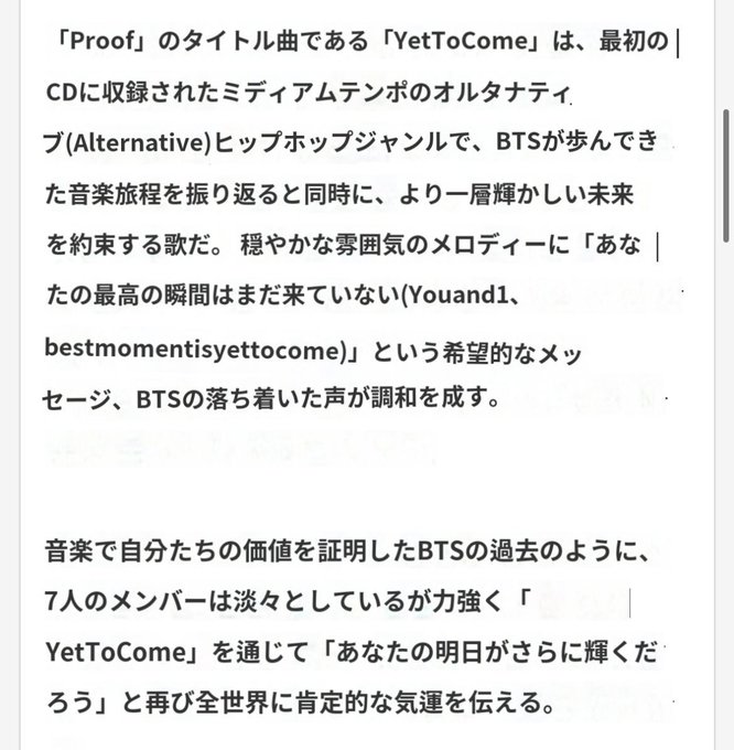 ✔️#yettocome はBTSが歩んできた音楽旅程を振り返ると同時に、より一層輝かしい未来を約束する歌。You and I, best moment is yet to comeという希望的メッセージ