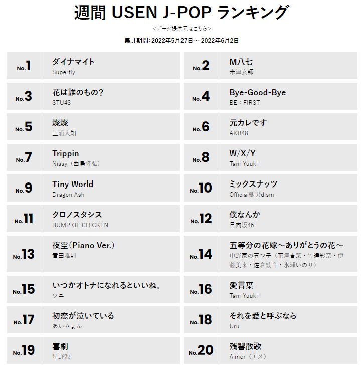 6/8付 最新! 週間USEN HIT J-POPランキング